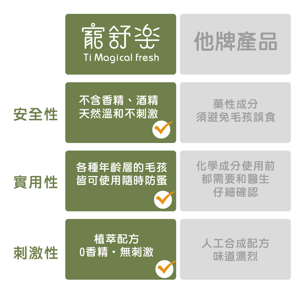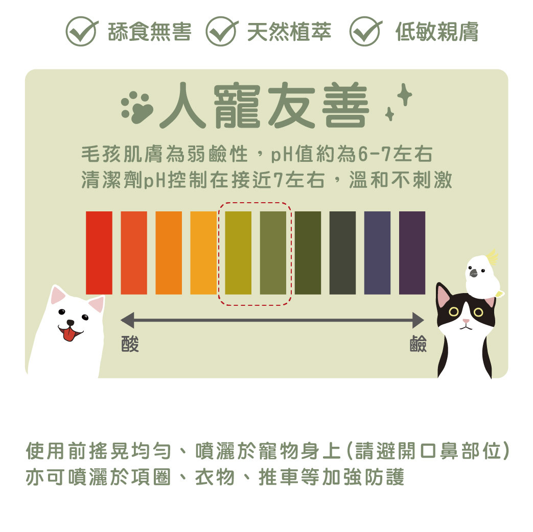 嚴選天然植萃精油,溫和寵物友善,不含化學香精與防腐劑,零酒精、DEET、趨蚊胺,安心防護全家人與毛孩。